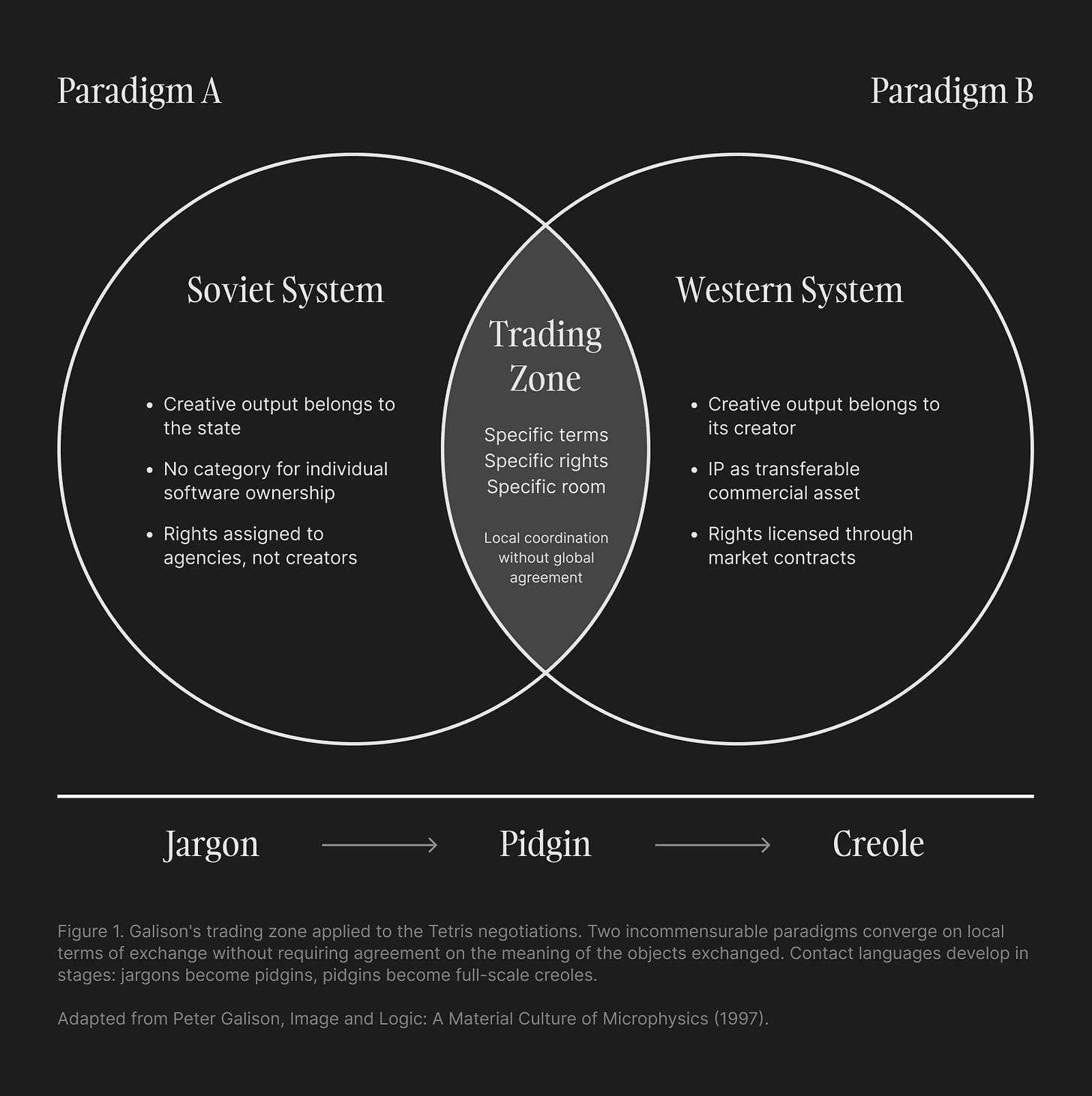 For Rogers and Pajitnov, the shared object was the game itself. Trading zones don’t require mutual comprehension. They require something both sides can point to, even if they describe it in different languages. Belikov built his zone out of contract clauses and hard currency. Rogers and Pajitnov built theirs out of falling blocks and vodka.