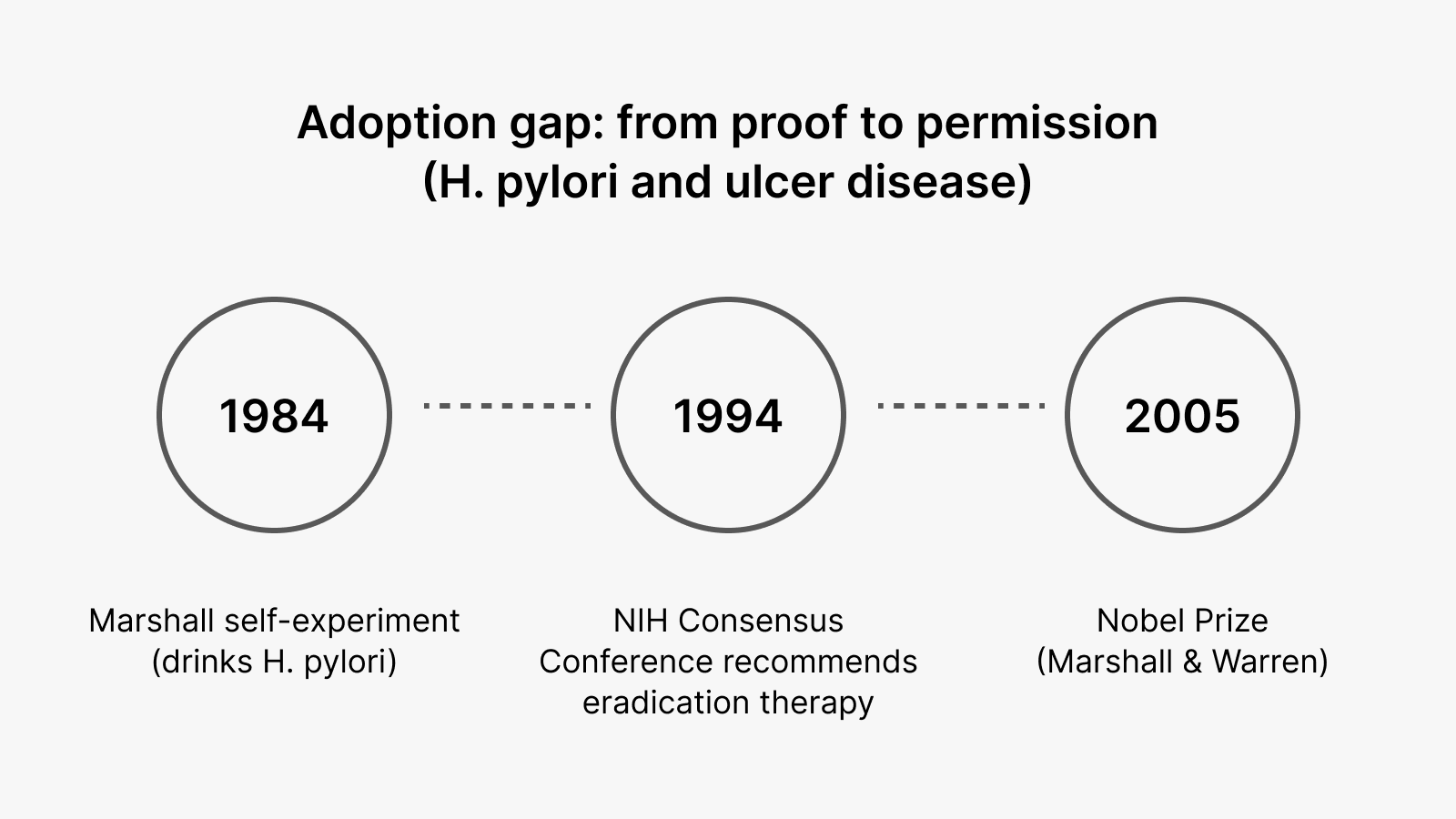 That’s a full decade after Marshall’s self-experiment. The new model had to become official before it became normal.