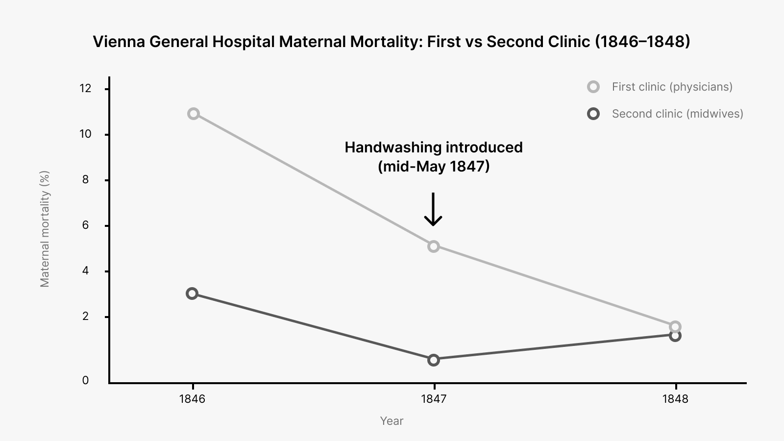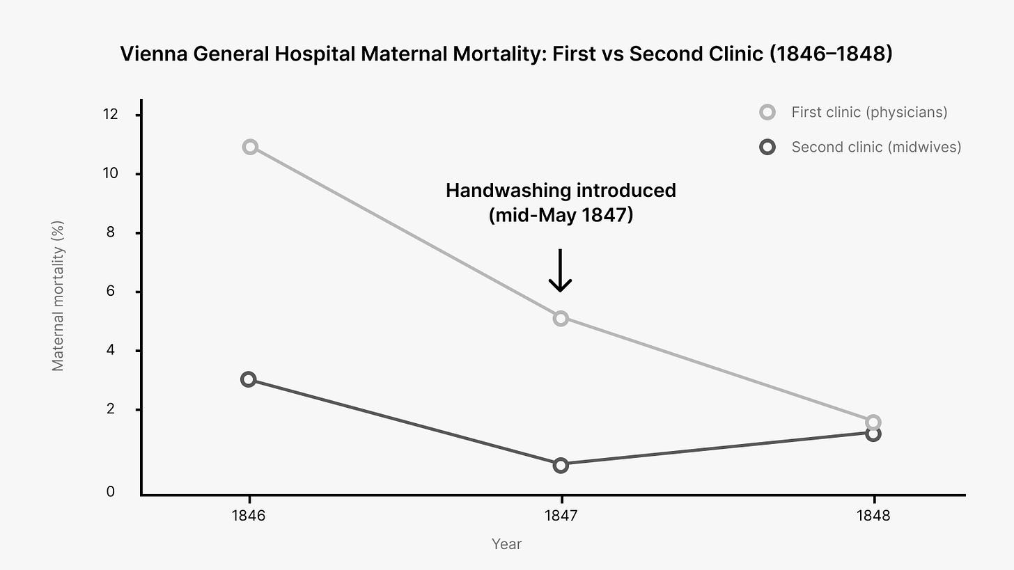 In the 1840s, at Vienna General Hospital, Ignaz Semmelweis observed that maternal mortality was far higher in the doctors’ clinic than in the midwives’ clinic.